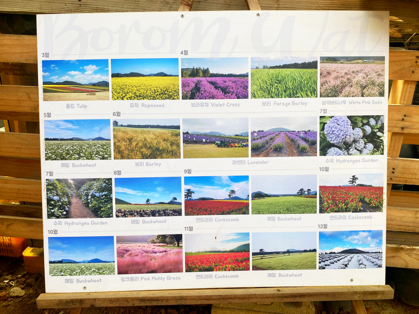 매달 달라지는 보롬왓의 풍경이예요. 3월에는 튤립, 유채 / 4월에는 보라유채, 보리, 삼색버드나무 / 5월에는 메밀 / 6월에는 보리, 라벤더, 수국 / 7월에는 수국 / 8월에는 메밀 / 9월에는 맨드라미, 메밀 / 10월에는 맨드라미, 메밀, 핑크뮬리 / 11월에는 맨드라미, 메밀을 구경하실 수 있어요. 저는 9월에 방문해서 빨간색, 노란색 맨드라미를 구경할 수 있었어요. 겨울을 제외하고 거의 일년 내내 꽃을 구경할 수 있어서 언제 와도 좋을 것 같아요.