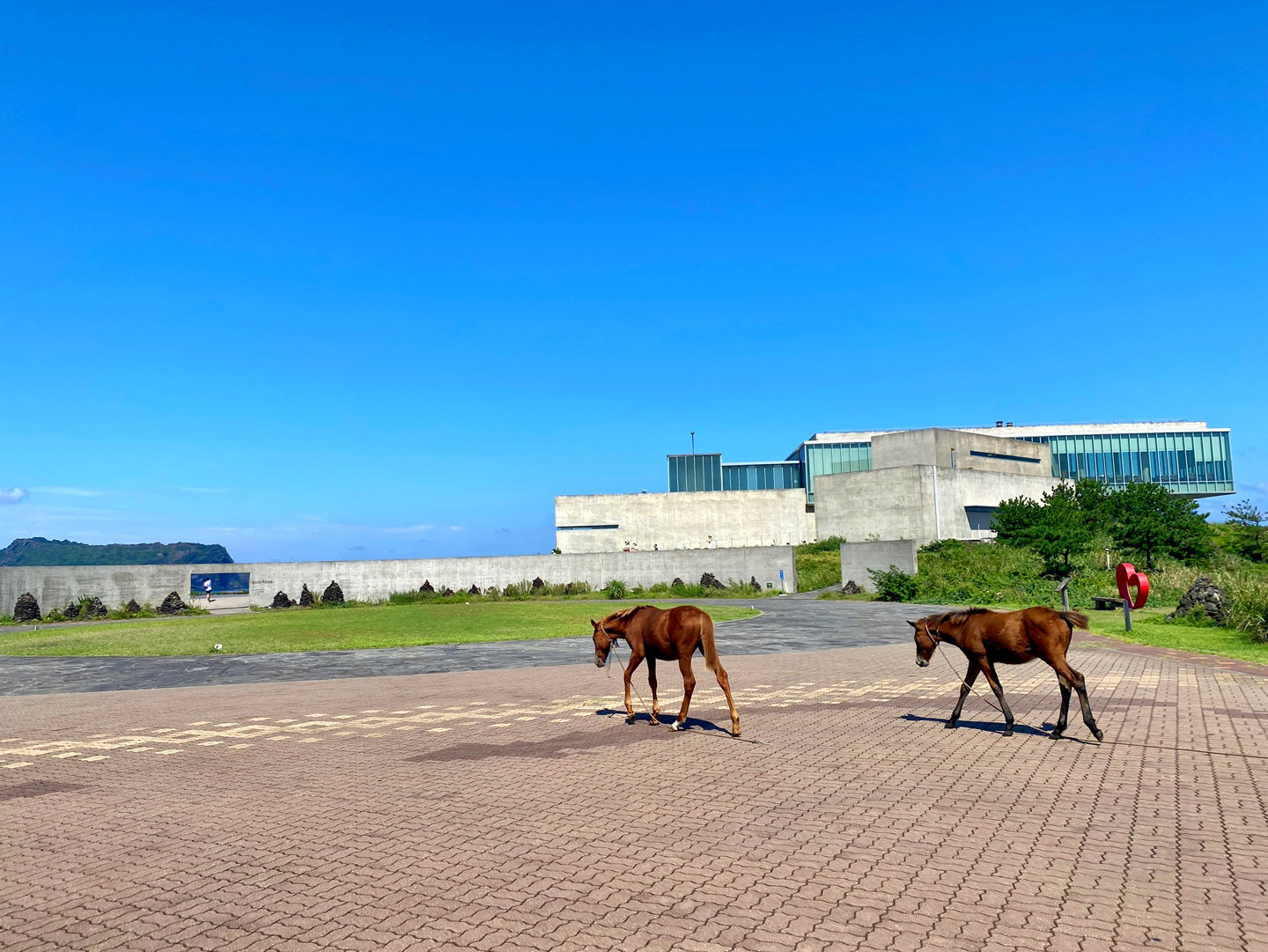 20분 정도 걸어가니 멋진 글라스하우스 건물이 눈에 띄었어요. 식사 중인 말들도 보여서 사진 찍으려고 다가갔는데… 무서워서 가까이 못 가겠더라구요. 글라스 하우스 담장(?), 벽에는 구멍이 뚫려 있어서 성산일출봉이 마치 액자에 들어 있는 그림처럼 보였어요. 파란 하늘과 바다, 거기에 초록빛의 성산일출봉이 굉장히 멋졌어요. 여기서 사진 찍으니까 진짜 예쁘더라구요.