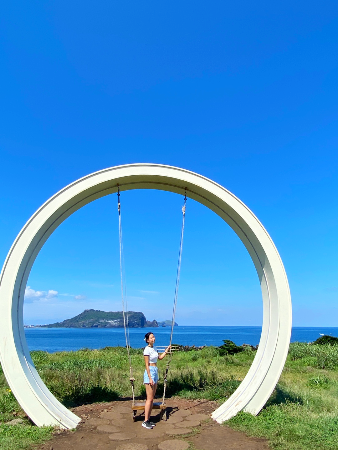 글라스하우스 건물을 돌아서 뒤쪽으로, 바다 쪽으로 가면 이렇게 동그라미 모양의 섭지코지 그네(그랜드 스윙)이 있었어요. 제가 갔을 때에는 사람들이 별로 없어서 기다렸다가 찍지는 않았어요. 동그란 그네 뒤쪽에 성산일출봉과 푸른 바다가 너무 아름다웠어요. 자연과 어울려진 멋진 포토존이었어요. 그네가 생각보다 낮아서 앉아서 찍는 거 보다는 이렇게 서서 찍는 게 더 예쁘게 나오더라구요.