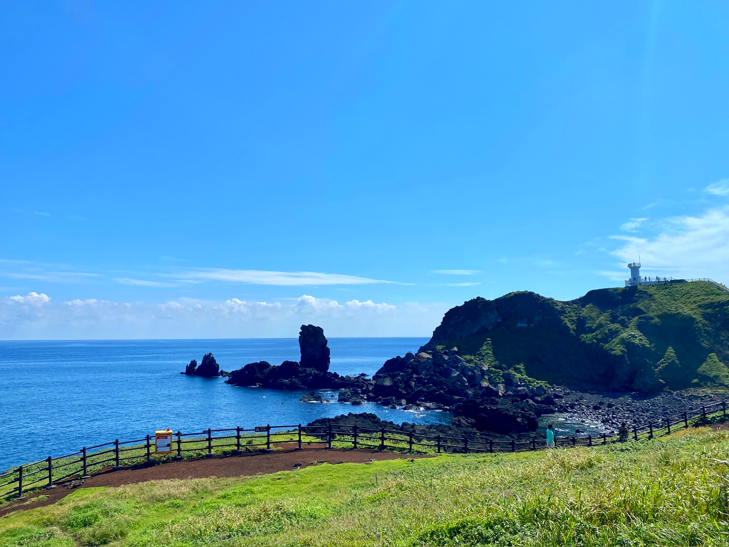 바위로 둘려진 해안절벽과 푸른 바다가 굉장히 멋있었어요. 나무와 풀은 초록초록하고 바다와 하늘은 파란 게 사진으로 너무 예쁘게 나왔어요. 저는 9월에 방문해서 여름 느낌이 나는 섭지코지 였는데 요즘 방문하시면 가을의 정취를 한 껏 느끼실 수 있을 거예요.