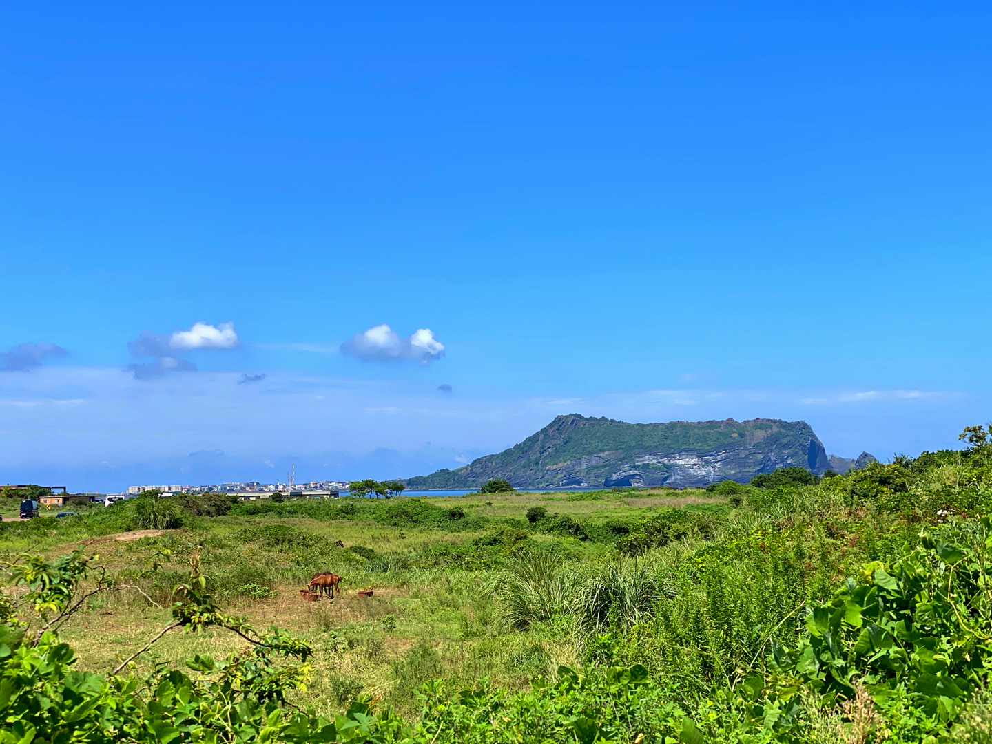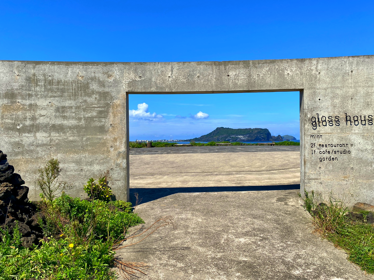 20분 정도 걸어가니 멋진 글라스하우스 건물이 눈에 띄었어요. 식사 중인 말들도 보여서 사진 찍으려고 다가갔는데… 무서워서 가까이 못 가겠더라구요. 글라스 하우스 담장(?), 벽에는 구멍이 뚫려 있어서 성산일출봉이 마치 액자에 들어 있는 그림처럼 보였어요. 파란 하늘과 바다, 거기에 초록빛의 성산일출봉이 굉장히 멋졌어요. 여기서 사진 찍으니까 진짜 예쁘더라구요.