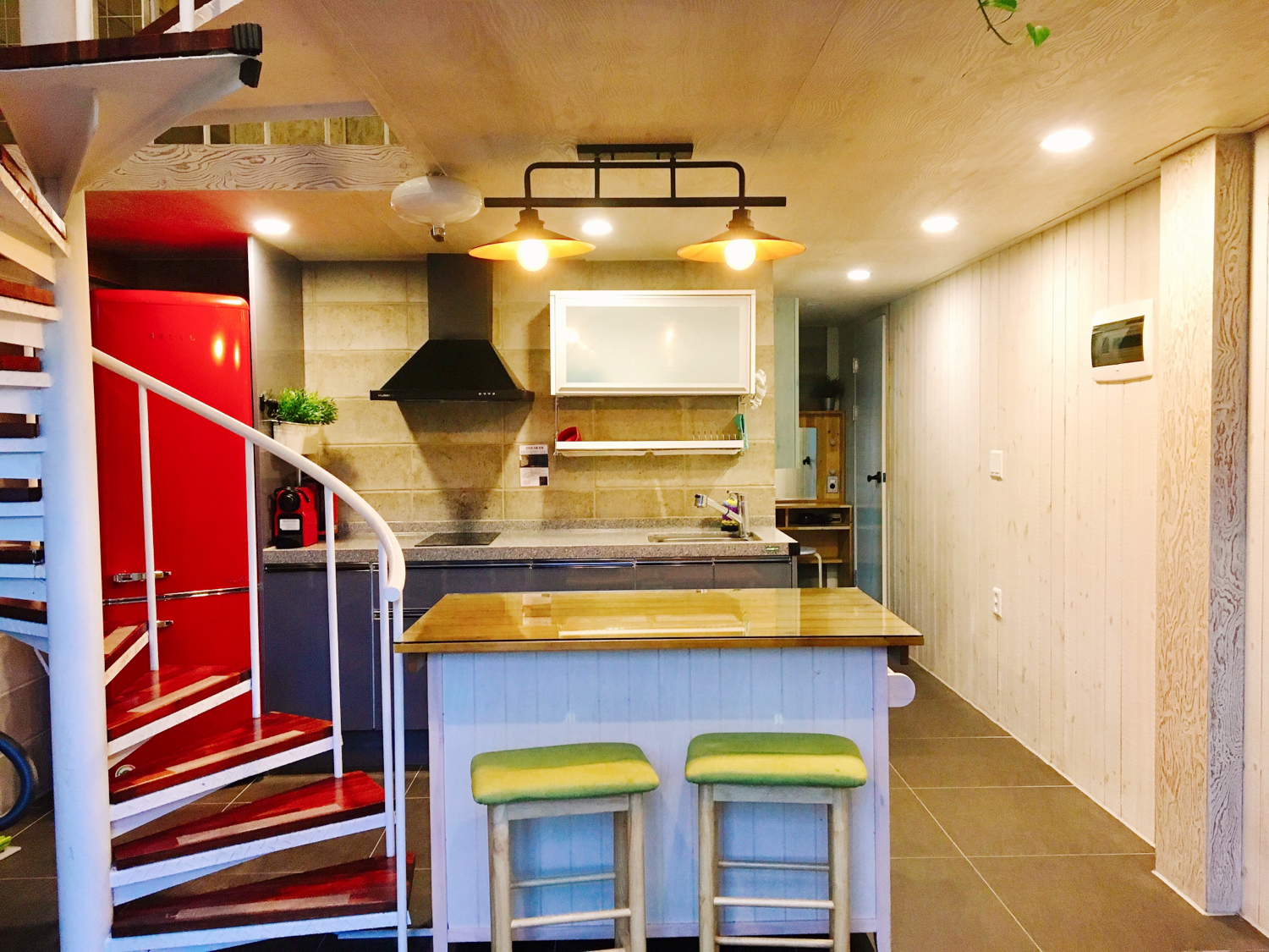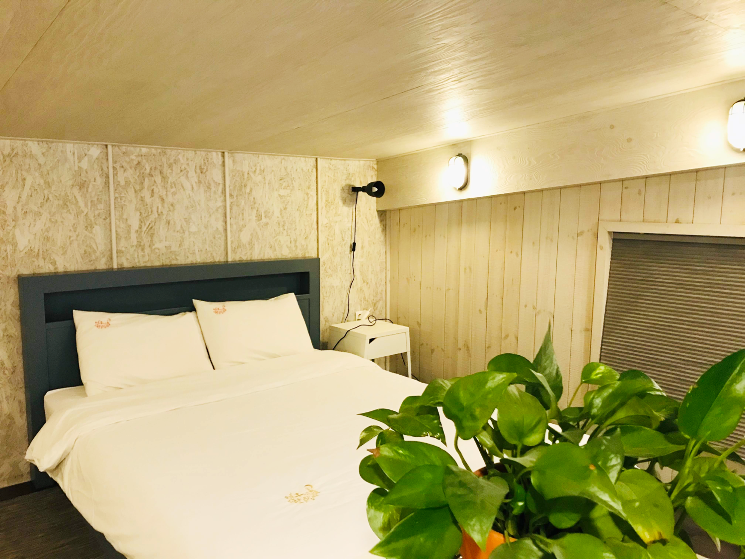 거실과 주방 사이에 있는 계단을 따라 2층으로 올라가면 1인용 소파와 침대가 놓여 있었어요. 침구류도 깨끗하고 포근하니 너무 좋았어요. 복층이기 때문에 화장실을 가려면 아래로 내려가야 하는 불편함이 있긴 했지만 커플 둘이서 사용하기에는 딱 좋았어요. 아이가 있는 경우에는 계단을 오르락 내리락 해야 해서 조금 위험할 것 같아요.
