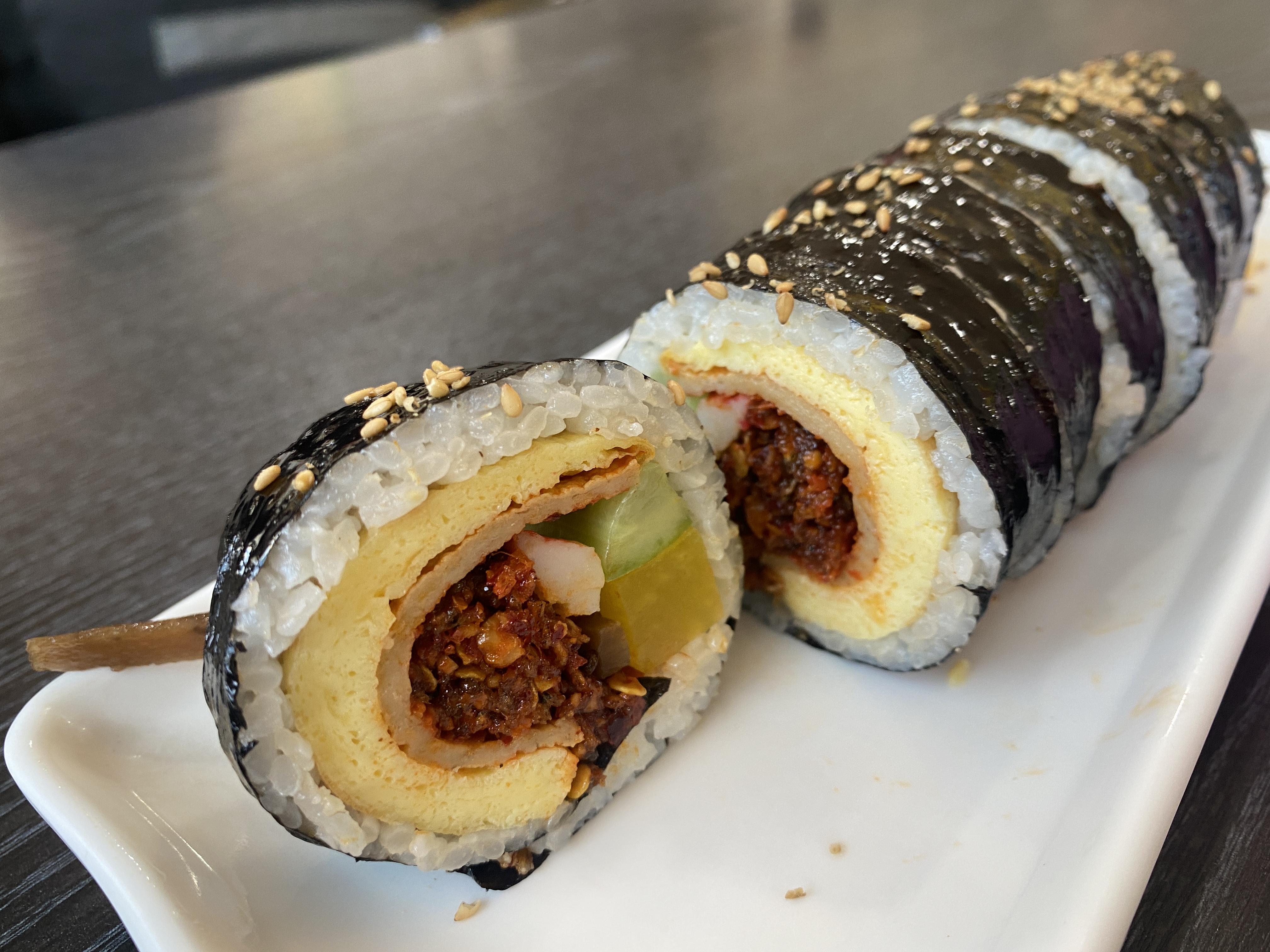 김유정 폐역에서 길을 건너면 다양한 맛집이 있었어요. 그 중에 가장 유명한 맛집인 광판팔뚝김밥 김유정역점에서 점심을 먹었어요. 매콤한 진미채김밥, 멸치김밥, 조금 덜 매운 참치김밥과 노랑진미김밥이 팔고 있었어요. 시그니처 메뉴 중에 하나인 매콤 멸치김밥 한줄 (3,500원)과 어묵 한 꼬치 (1,000원)을 먹었어요. 가게 이름처럼 팔뚝만한 튼실한 김밥이 나왔어요. 가격도 저렴하고 혼자 먹기에 딱 좋은 양이 었어요. 멸치가 생각보다 매콤해서 매운 음식 잘 못드시는 분들은 덜 매운 김밥을 추천드려요.