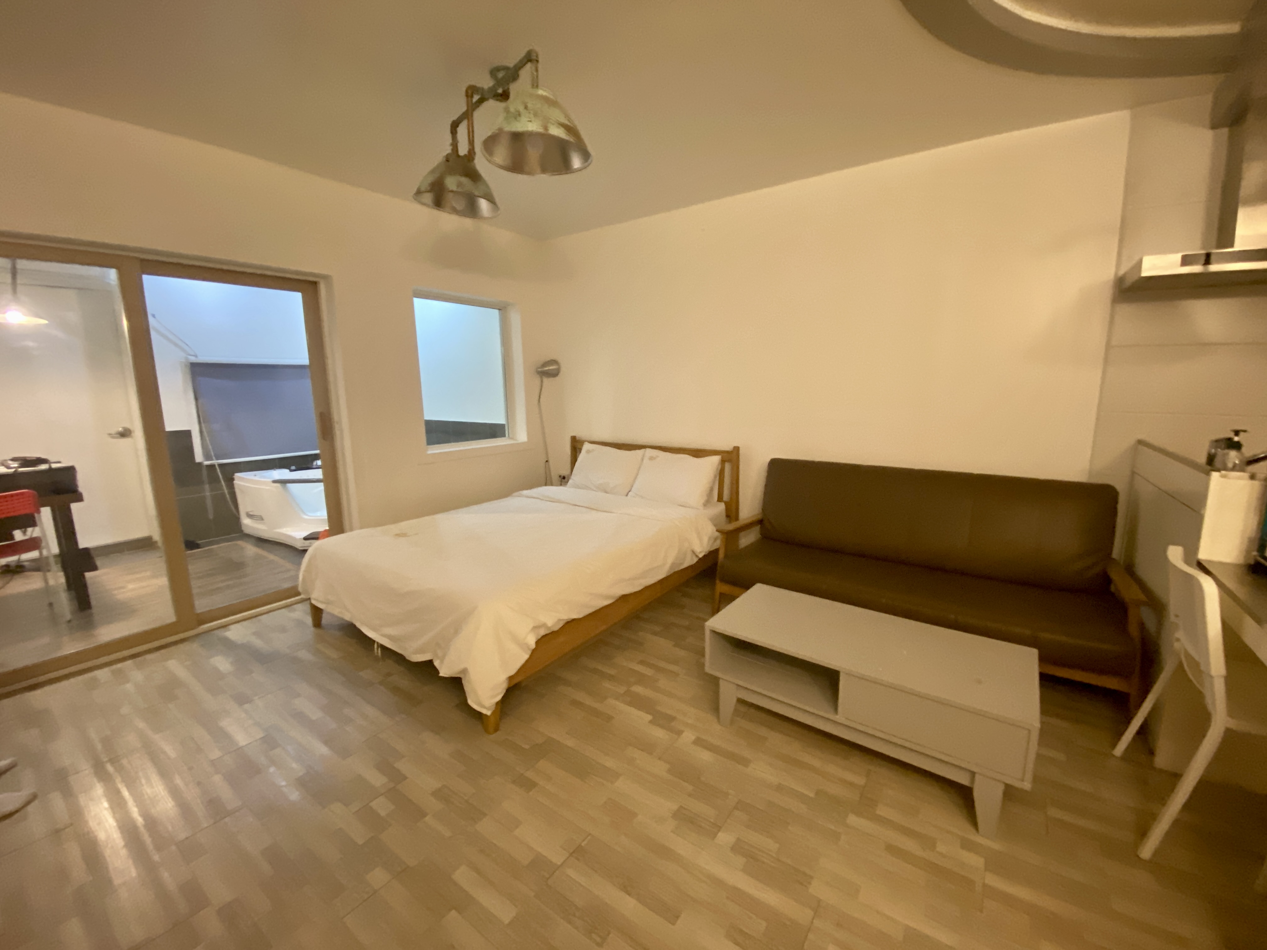 바베큐 테이블과 스파욕조를 지나 유리문을 열고 들어오면 침실과 부엌이 나와요. 내부가 화이트+우드+벽돌로 인테리어 되어 있어서 깔끔하고 고급스러웠어요. 요즘 대부분의 펜션이나 모텔은 크기가 진짜 작은데 가평스파펜션 여우가 달을 사랑할 때 펜션은 넓어서 답답하지 않고 좋았어요. 침대 옆에는 넓은 소파도 있었고 낮은 테이블도 있어서 텔레비전 보기 좋았어요.