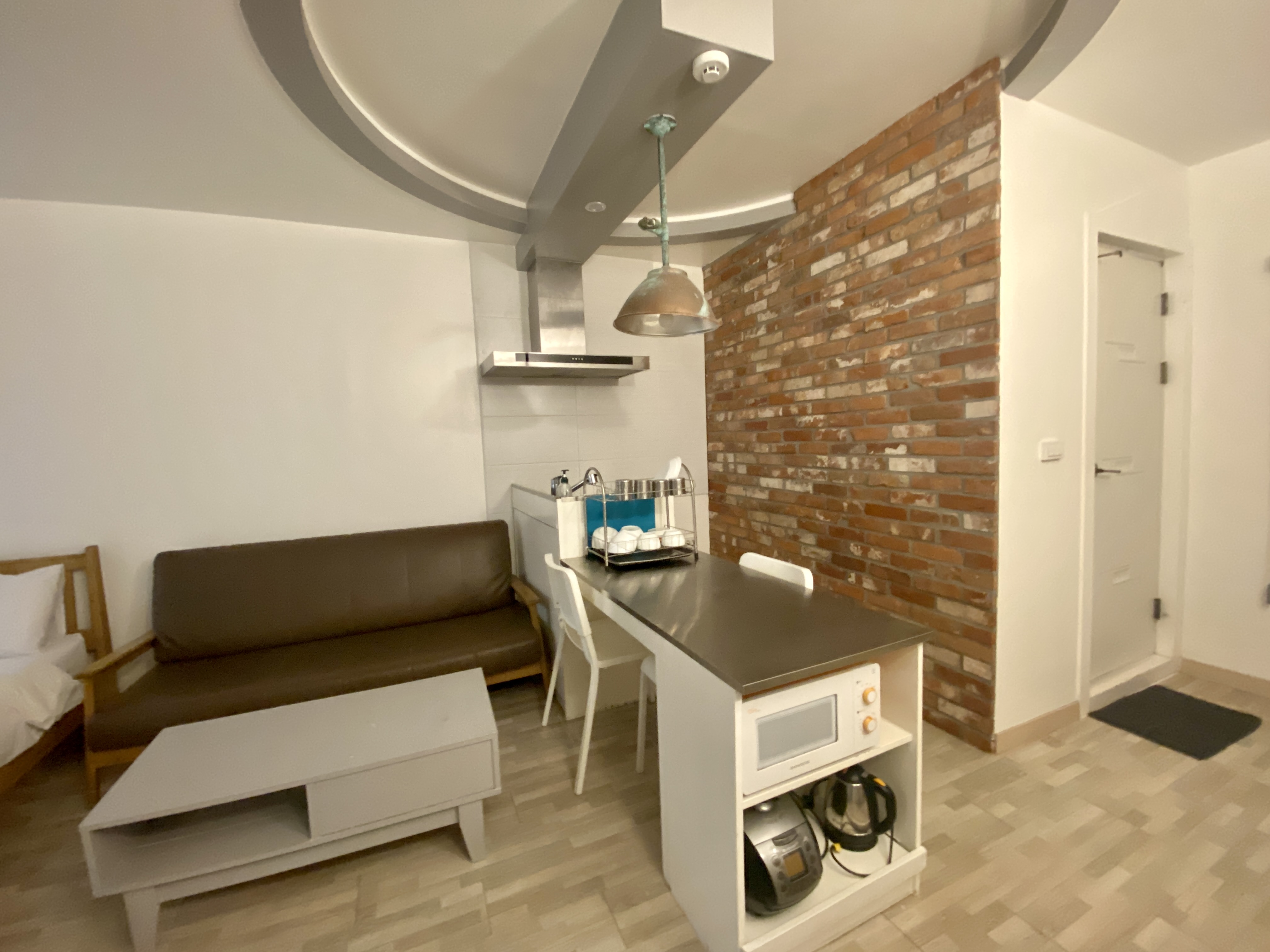 소파 옆에는 바로 싱크대와 테이블이 있었어요. 인덕션은 1구가 있었고, 싱크대도 아담한 1인용 사이즈였어요. 테이블이 커서 바베큐 재료 준비하기에 좋았어요. 접시, 컵도 넉넉하게 있었고, 냄비와 후라이팬도 있었어요. 전자레인지, 밥솥, 전기포트도 있어서 햇반이나 컵라면 먹기도 편했어요. 냉장고는 화장실 앞쪽에 있었고 아래 사진 참고 하세요!
