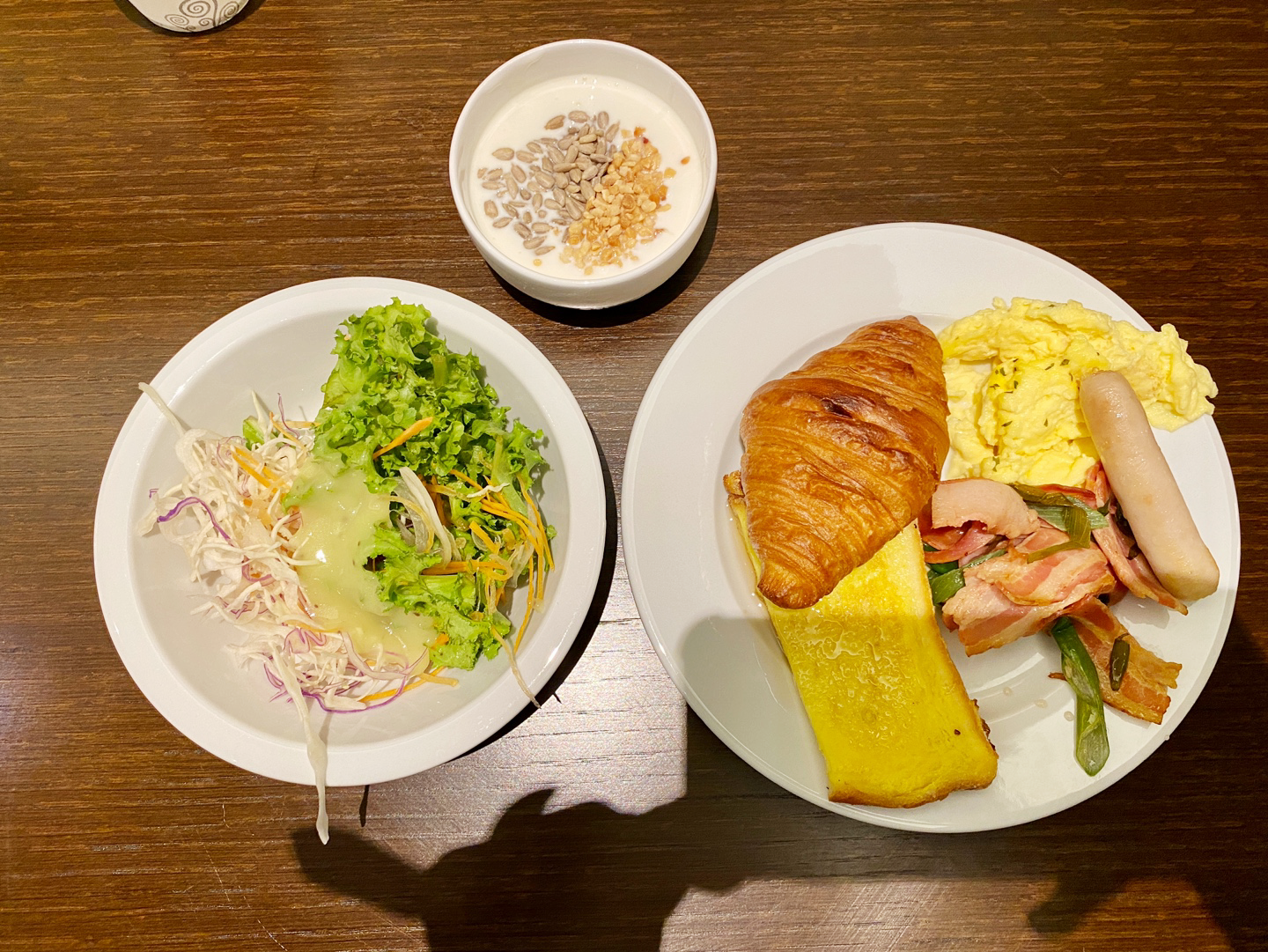 인터넷으로 조식에 대해 찾아볼 때에는 별로 기대를 안 했는데 직접 보니 꽤 만족스러웠어요. 샐러드, 크로와상, 식빵, 프렌치 토스트 등의 양식요리, 잡채, 복음밥 등의 한식요리. 마무리로 커피까지 있어서 다양하게 먹을 수 있었어요. 아쉬웠던 점은 사람이 많지 않아서 음식 순환이 빠르지 않았다는 점이예요. 순환이 빨랐으면 더 따뜻하고 금방 나온 음식들을 먹을 수 있었을 것 같아요.