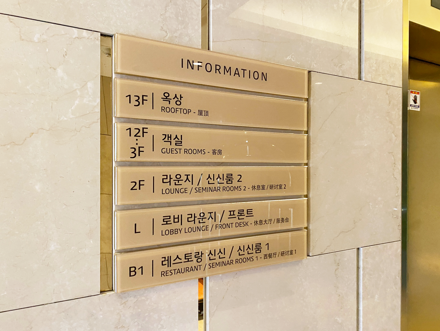 체크인을 마친 뒤 방으로 올라갔어요. 엘리베이터 옆에는 층별 안내도가 적혀 있었어요. 지하1층은 레스토랑, 1층은 로비, 2층은 라운지, 3층~12층은 객실, 13층은 옥상이었어요. 지하1층과 2층에는 세미나실이 있었어요. 지하 1층은 80~100석, 2층은 30~50석 규모의 세미나실이었어요. 아마 세미나실이 위에 보이시는 신신룸1, 신신룸2 인 것 같아요. 세미나룸 렌탈은 3시간 기준으로 이용가능하고, 현수막, 빔, 스크린, 마이크를 이용하시려면 추가 비용이 있었어요. 공항과 가깝고 세미나룸도 있기 때문에 비즈니스로 오시는 분들께 좋을 것 같아요.