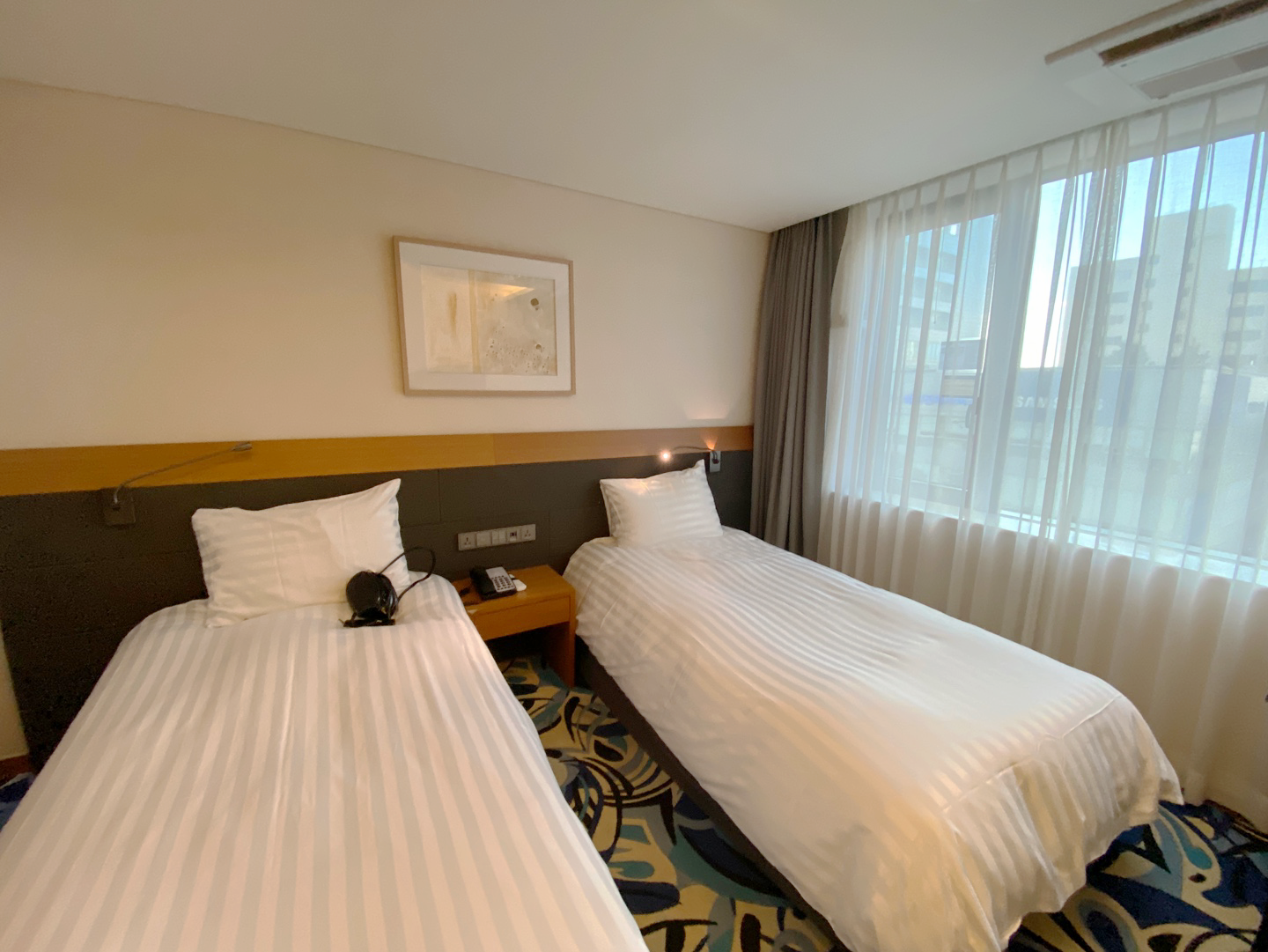 신신호텔 제주공항은 슈페리어 더블, 슈페리어 트윈, 패밀리 트리플, 디럭스 더블 트윈, 스위츠, 주니어스위트, 로얄스위트로 총 209개의 객실이 운영 중이예요. 저희는 슈페리어 트윈을 이용했고 룸1(싱글베드2), 욕실1로 구성되어 있는 방이었어요.