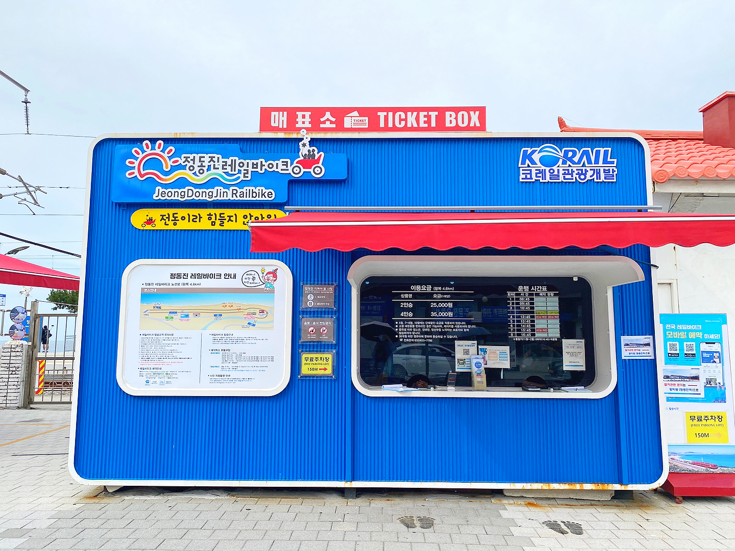 정동진역 매표소는 정동진역 광장에 있으며, 정동진역 탑승장은 정동진역 승강장을 통해서 이동했으며 매표소에서 약 300미터 떨어진 거리에 있었어요. 모래시계공원 내 시간박물관에서 레일바이크 탑승권을 구매하셔야 하고, 모래시계공원 탑승장은 시간박물관에서 약 50미터 거리에 위치하고 있다고 해요.