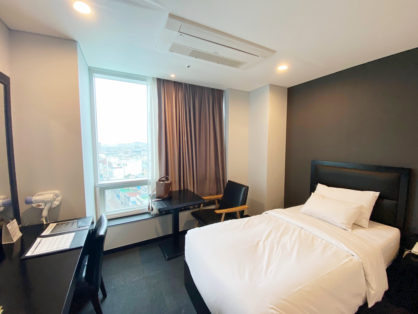 싱글베드가 2개 비치되어 있는 스탠다드 트윈 룸이예요. 잠은 따로 자야 편하게 자기 때문에 침대가 2개 있는 방으로 선택했어요. 창가에는 테이블과 의자가 놓여 있어서 앉아서 창밖을 구경하기 좋았어요. 방에는 냉난방 조절이 가능한 리모컨, 전화기, TV, 에어컨, 거울, 냉장고, 생수, 드라이기, 녹차, 홍차, 민트차, 커피, 전기포트, 슬리퍼가 구비되어 있었어요. 침구류는 깨끗하고 폭신했어요. 룸에서는 냄새도 안났고 바닥도 깔끔하고 좋았어요.